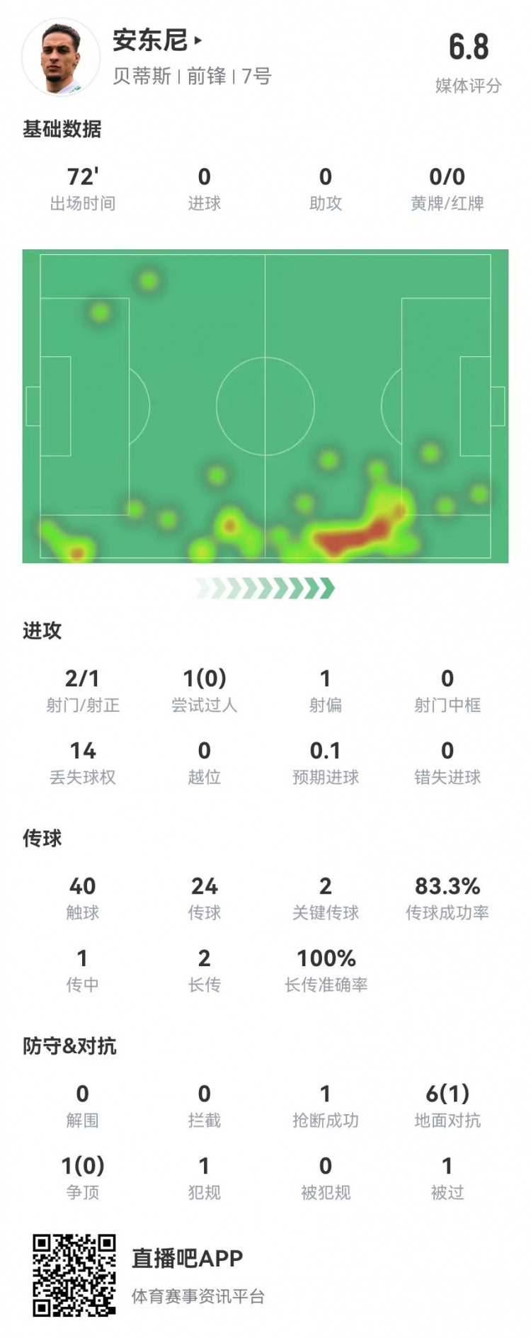 安東尼首秀數(shù)據(jù):2關(guān)鍵傳球+1造良機 7對抗1成功 獲評6.8分 2月3日訊 貝蒂斯在本輪西甲2-2暫時戰(zhàn)平畢巴,從曼聯(lián)外租而來的安東尼首秀數(shù)據(jù)如下:出場72分鐘40觸球24傳球、20成功,成功率83%2關(guān)鍵傳球1傳中、1成功2長傳、2成功1創(chuàng)造重大機會2射門、1射 2025/02/03