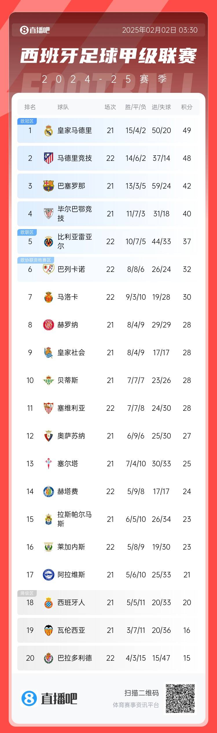 西甲積分榜:馬競先賽1場距榜首1分 巴薩落后皇馬7分位居第三 2月2日訊 西甲聯(lián)賽第22輪,馬競2-0馬洛卡,先賽距榜首1分。最新西甲積分榜↓ 2025/02/02