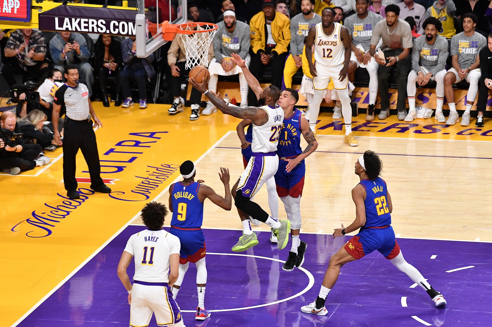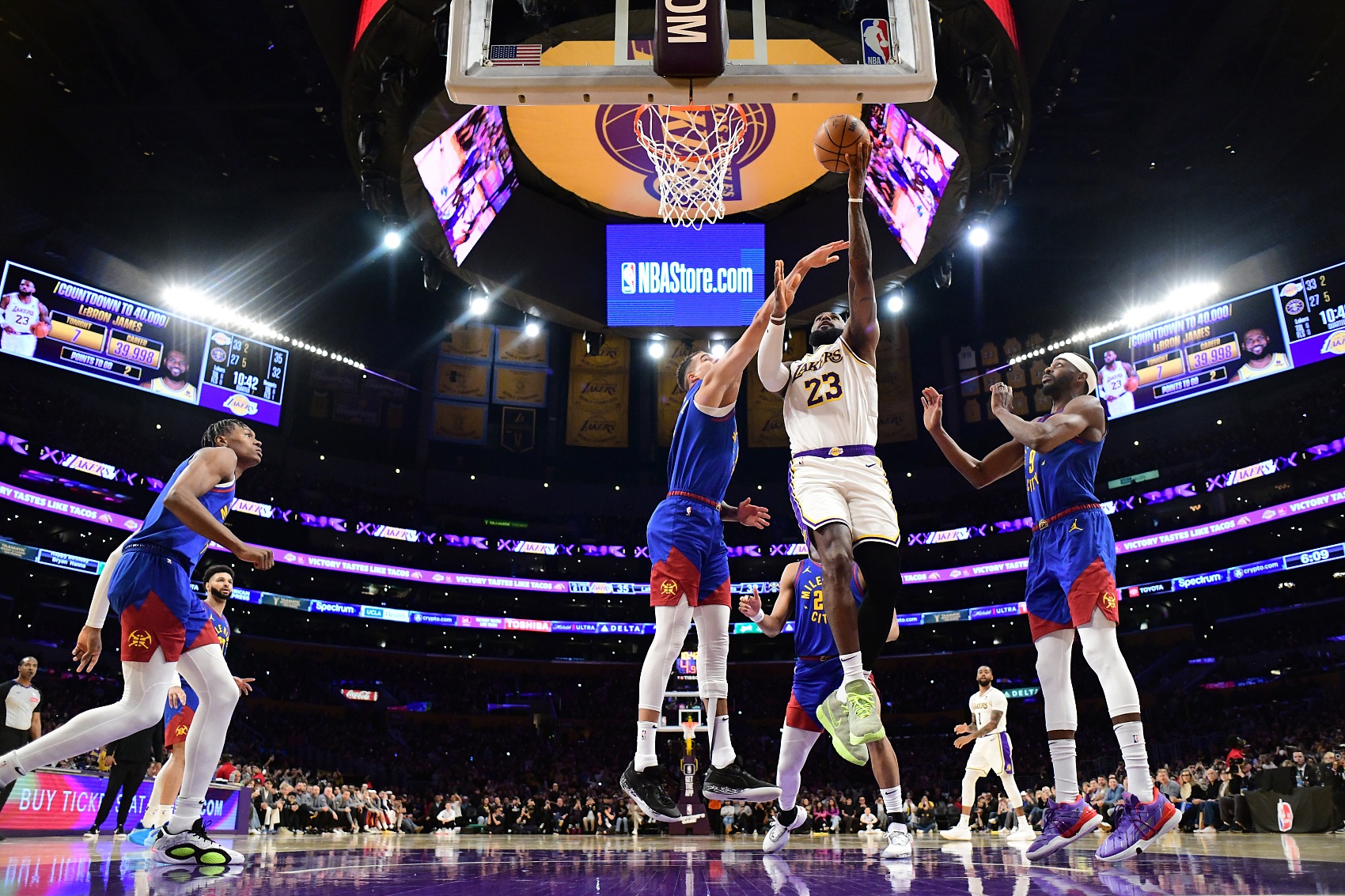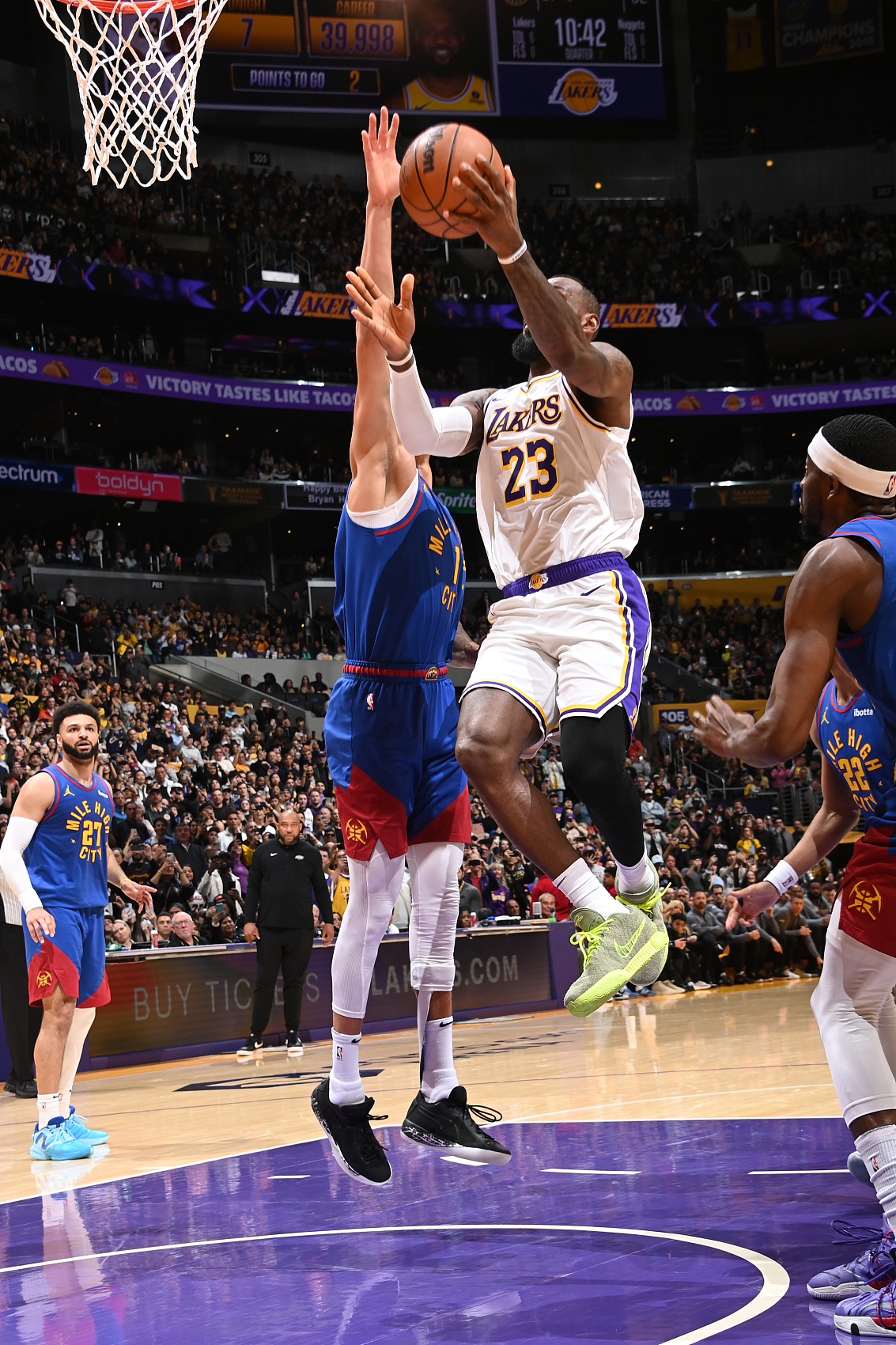 此役,湖人主場114-124不敵掘金,詹姆斯在第二節(jié)面對小邁克爾-波特上籃打進(jìn),完成了這歷史性的一刻。