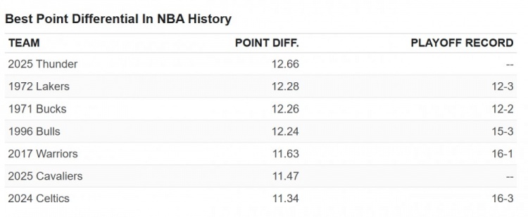 (圖為NBA歷史上的最高凈勝分紀(jì)錄,第一列為球隊(duì),第二列為場均凈勝分,第三列為季后賽戰(zhàn)績)