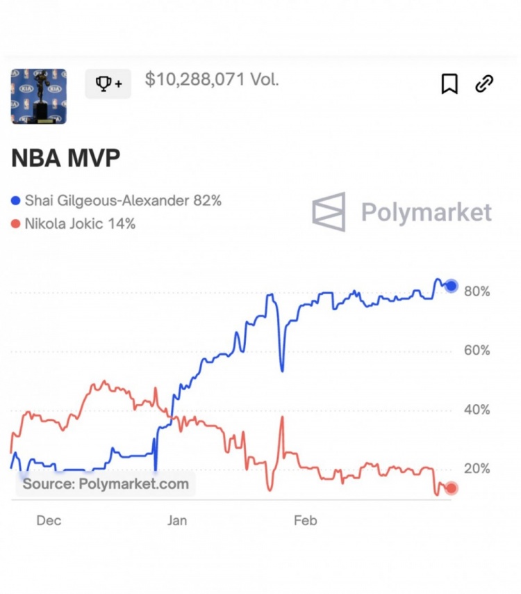 賽后美媒Polymarket更新了MVP概率,約基奇僅有14%,而亞歷山大則高達(dá)82%。