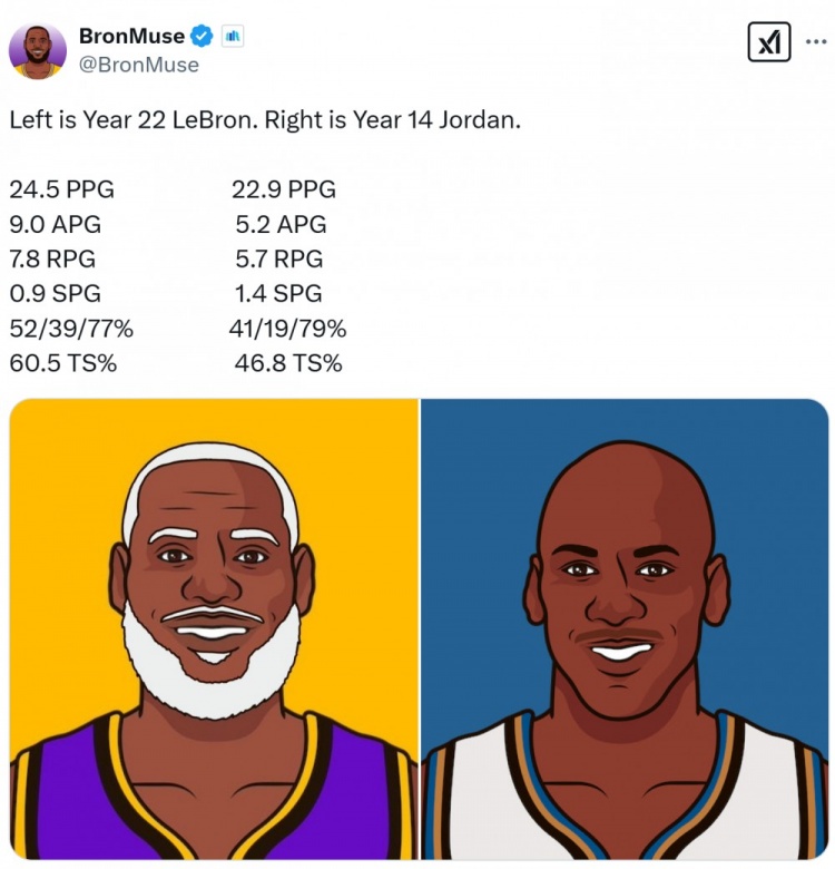 詹姆斯生涯第22季場均24.5分7.8籃板9助攻0.9搶斷,三項命中率52/39/77%,真實命中率60.5%;