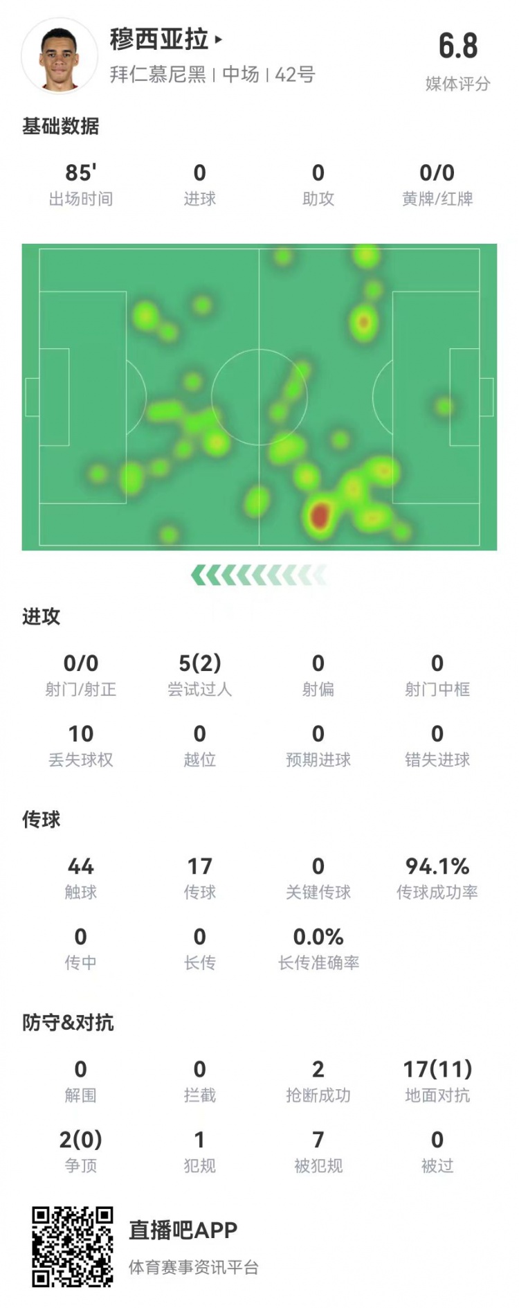 2月16日訊 拜仁在本輪德甲客場0-0暫時戰(zhàn)平勒沃庫森,剛剛頂薪續(xù)約的穆西亞拉本場數(shù)據(jù)如下: