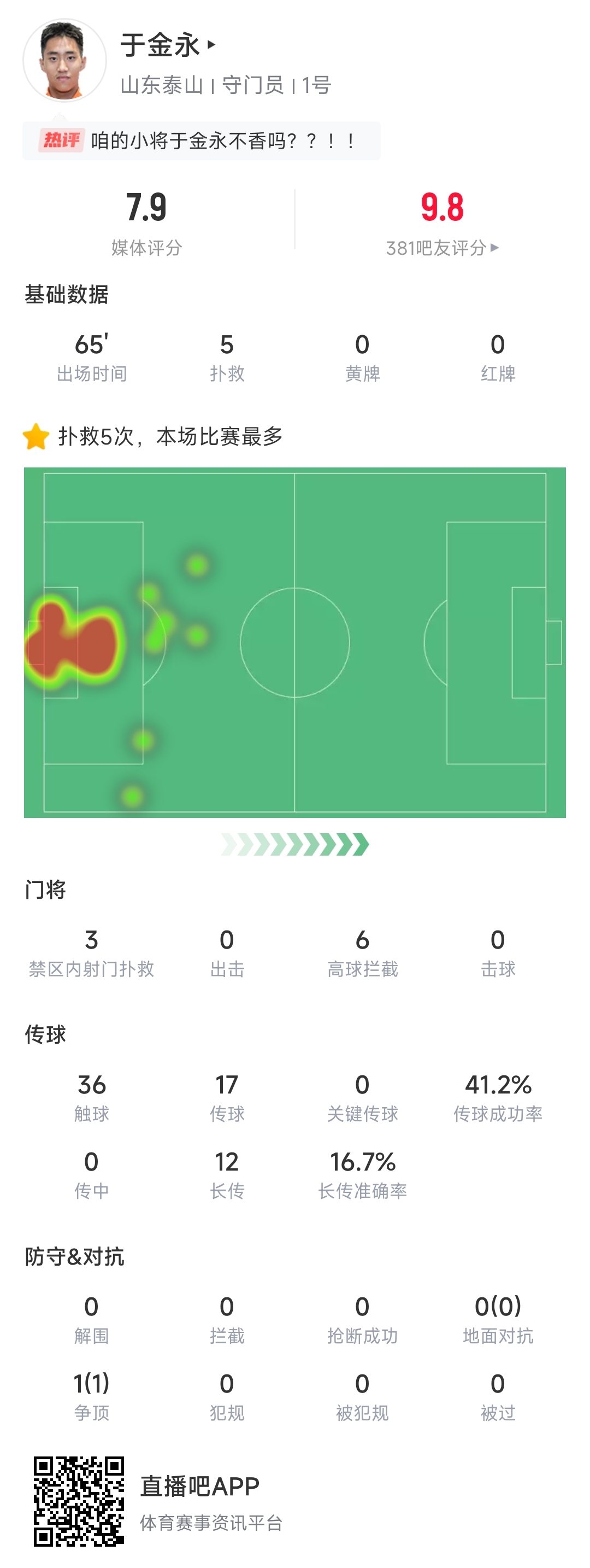 02月23日訊 中超第1輪,山東泰山主場0-0戰(zhàn)平河南隊(duì),在首發(fā)門將王大雷第23分鐘就被紅牌罰下的情況下,20歲的替補(bǔ)門將于金永臨危救主,全場貢獻(xiàn)5次撲救,力保球門不失。