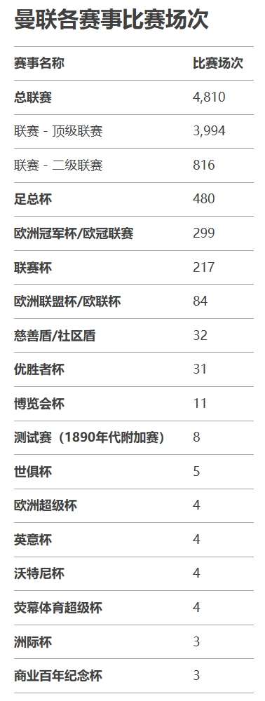 曼聯(lián)這5999場比賽中,超過4800場為聯(lián)賽,480場為足總杯,299場為歐冠及其前身,此外還包括各類杯賽。