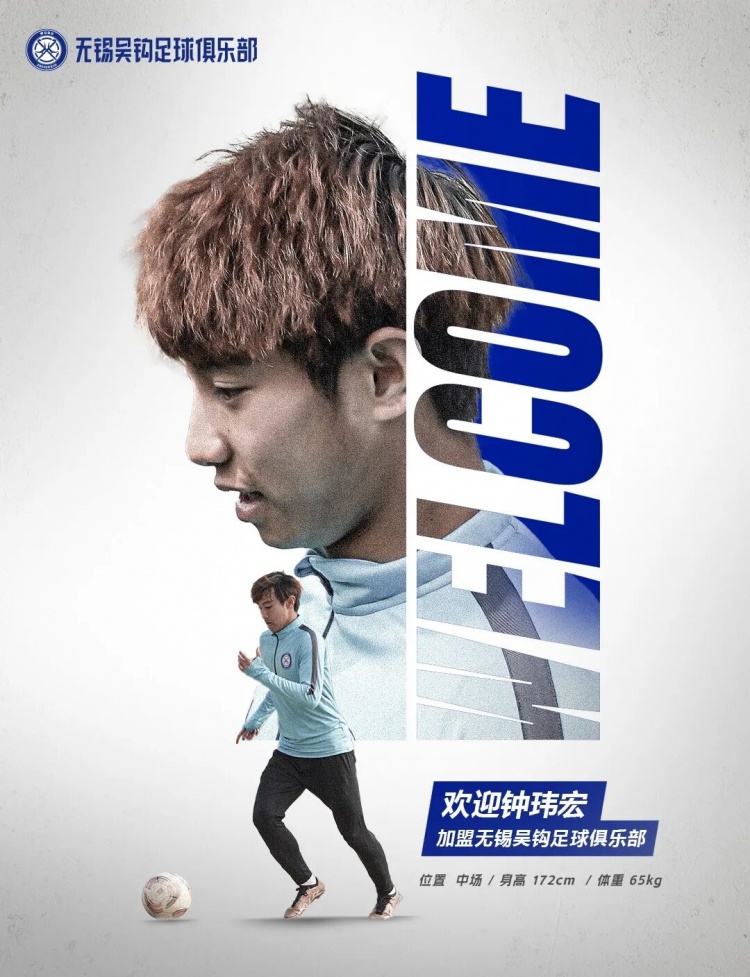 我們?cè)诖肃嵵匦迹?jīng)雙方協(xié)商一致,球員鐘瑋宏租借加盟無(wú)錫吳鉤足球俱樂(lè)部。2025賽季,他將為無(wú)錫而戰(zhàn)!