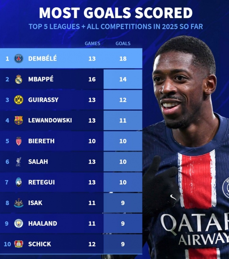 3月4日訊 《轉(zhuǎn)會市場》統(tǒng)計了2025年五大聯(lián)賽球員各項賽事進(jìn)球情況,登貝萊居首。