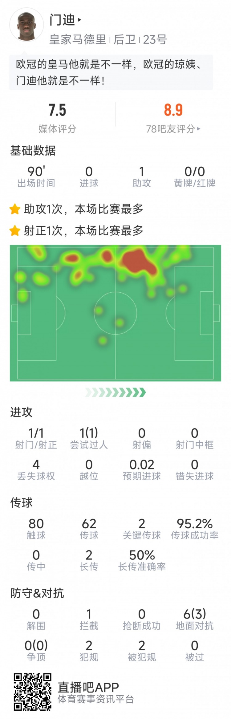 3月5日訊 在本輪歐冠皇馬2-1擊敗馬競(jìng)的比賽中,門迪送出一次助攻,以下為他在本場(chǎng)數(shù)據(jù):