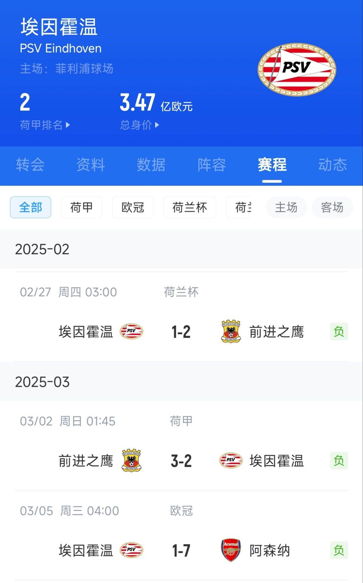 6天前的2月27日,埃因霍溫荷蘭杯半決賽1-2不敵前進之鷹,無緣決賽。3天前的荷甲聯(lián)賽,埃因霍溫2-3被前進之鷹雙殺,荷甲再丟3分,距離榜首阿賈克斯已有8分差距。今天凌晨,埃因霍溫歐冠遭遇慘敗,出局幾乎板上釘釘。