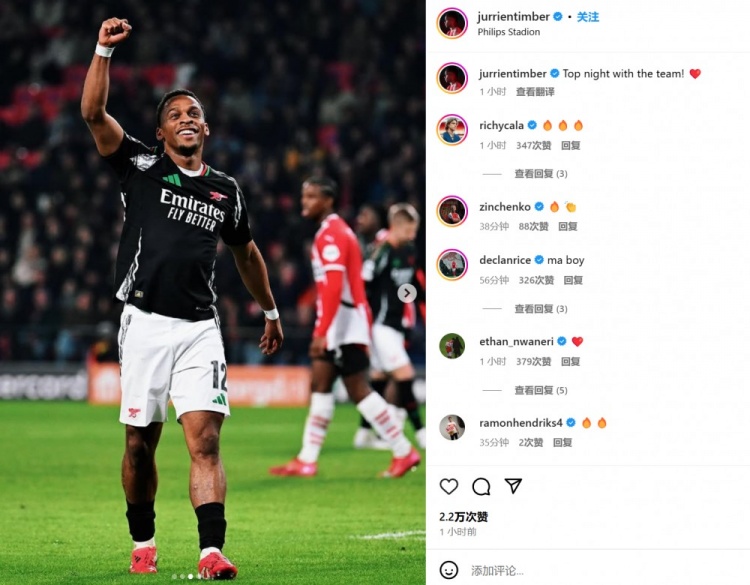 廷伯在本場比賽為槍手第18分鐘頭球首開記錄,他也曬出慶祝照并配文:“全隊(duì)表現(xiàn)頂級(jí)的一晚!”
