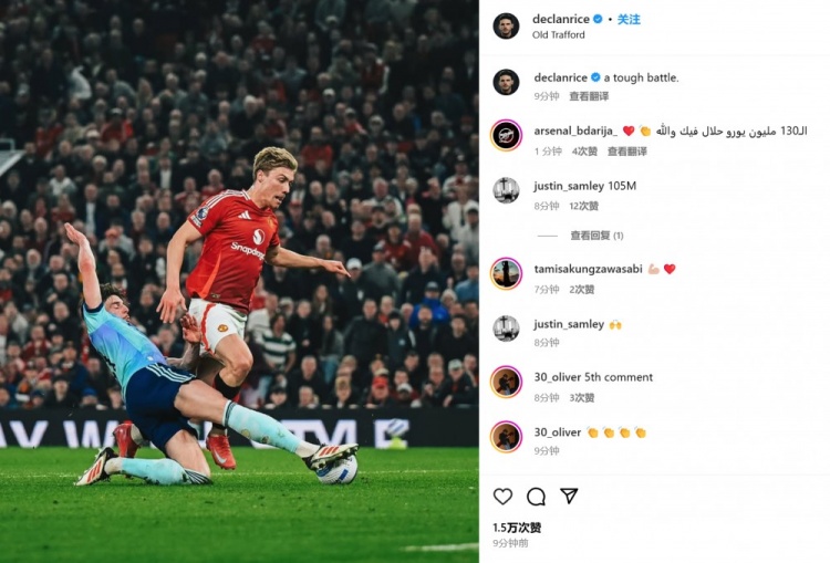 賴斯也通過社媒曬出自己倒地放鏟破壞霍伊倫單刀球的瞬間照,并配文:“一場艱難的戰(zhàn)斗。”