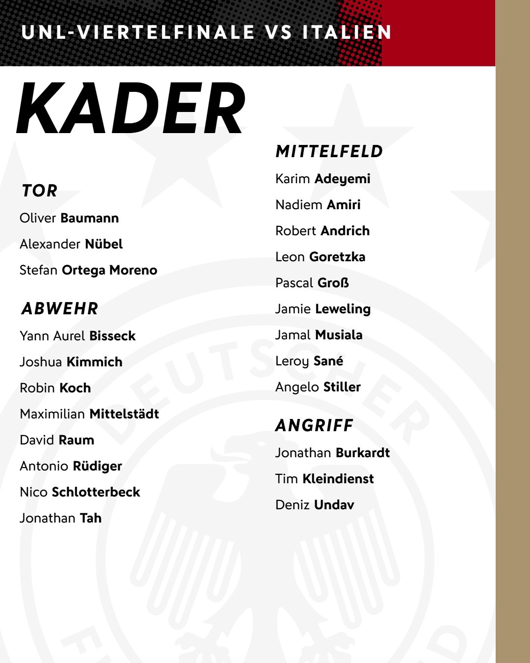 后衛(wèi):比塞克(國際米蘭)、基米希(拜仁)、科赫(法蘭克福)、米特爾施泰特(斯圖加特)、勞姆(RB萊比錫)、呂迪格(皇馬)、尼科-施洛特貝克(多特)、若納坦-塔(勒沃庫森)