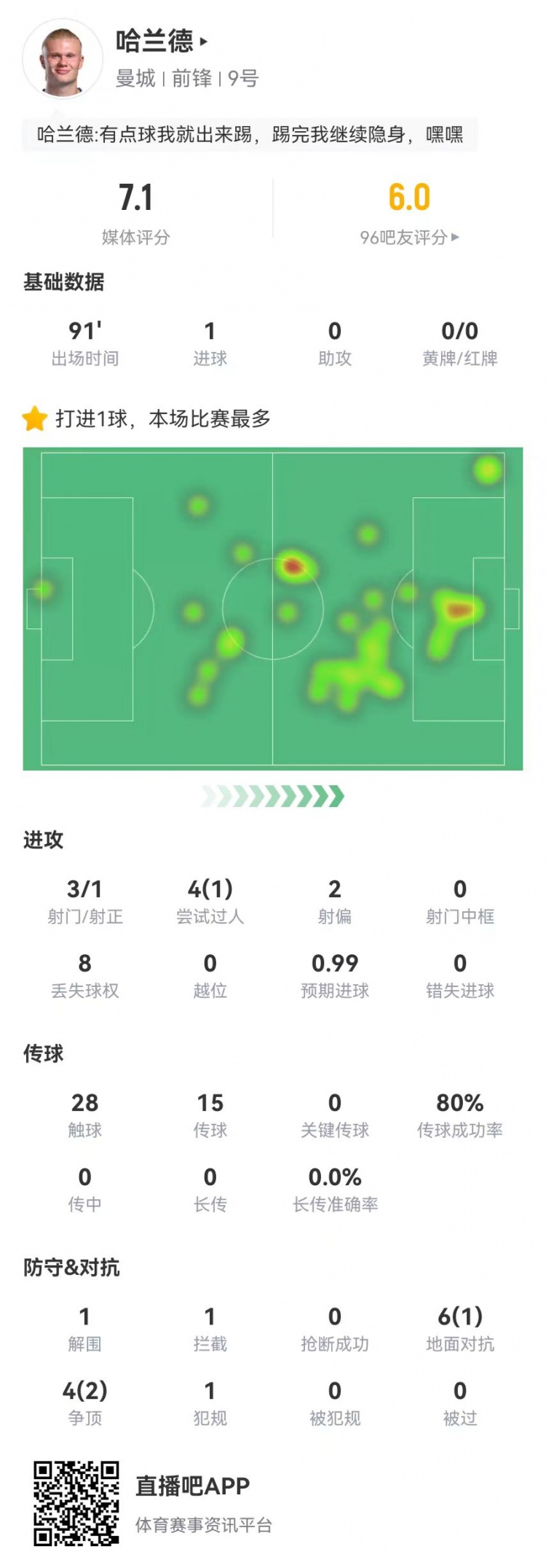 3月16日訊 曼城在本輪英超2-2戰(zhàn)平布萊頓,哈蘭德本場數(shù)據(jù)如下: