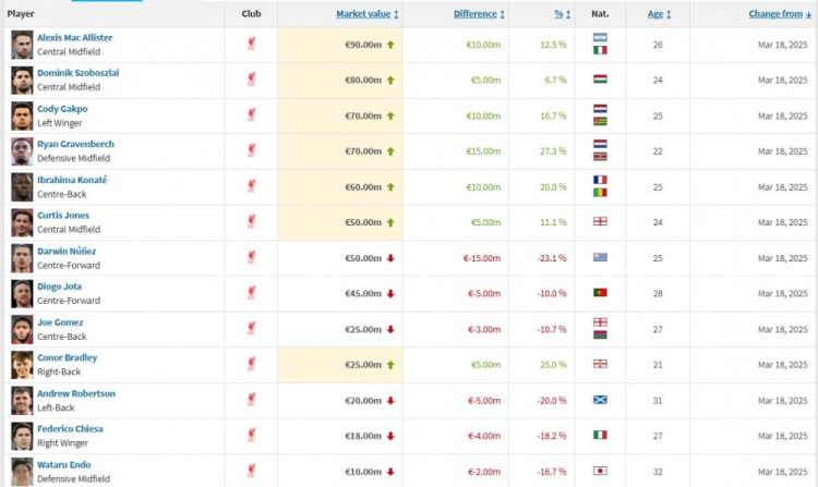 3月18日訊 德轉(zhuǎn)更新了部分英超球員身價,在此次更新中有13位利物浦球員身價發(fā)生了變化,其中6人出現(xiàn)下跌,7人出現(xiàn)上漲。
