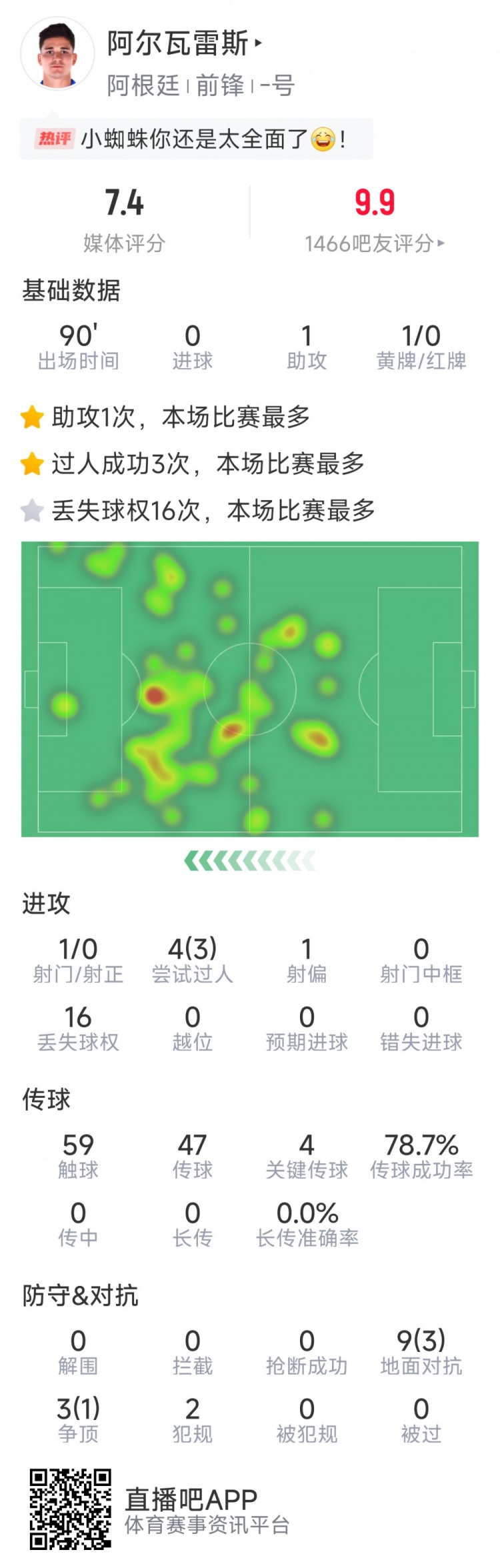 3月22日訊 在本輪南美區(qū)世預(yù)賽,阿根廷1-0擊敗烏拉圭,阿爾瓦雷斯首發(fā)出戰(zhàn)表現(xiàn)出色,以下為他在本場數(shù)據(jù):