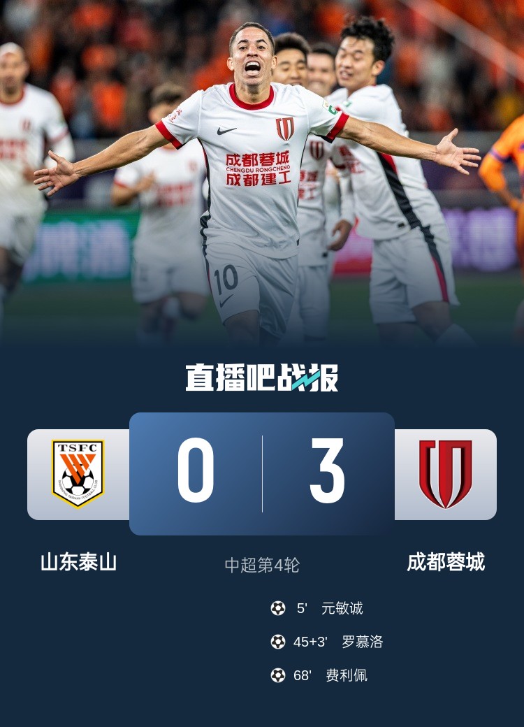 中超第4輪,成都蓉城客場3-0完勝山東泰山,終結(jié)了對對手的三連敗。