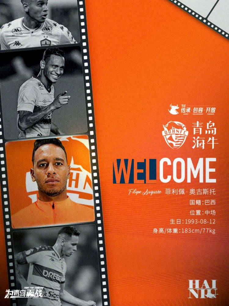經(jīng)友好協(xié)商并達(dá)成一致,自即日起菲利佩·奧古斯托(Filipe Augusto)自由身加盟青島海牛足球俱樂部。菲利佩·奧古斯托與俱樂部簽署1+1合同,歡迎他的到來。